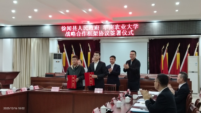 吴国雄对我校在社会服务、科技支撑及人才培养等方面所做的贡献表示感谢。他指出,过去四年间,华农不仅系统破解了长期制约徐闻特色农业产业健康发展的关键技术难题,还累计培训农民4000多人次,有效加速了科技成果落地转化,促进了本土人才成长,为徐闻农业产业升级提供了有力支撑。
