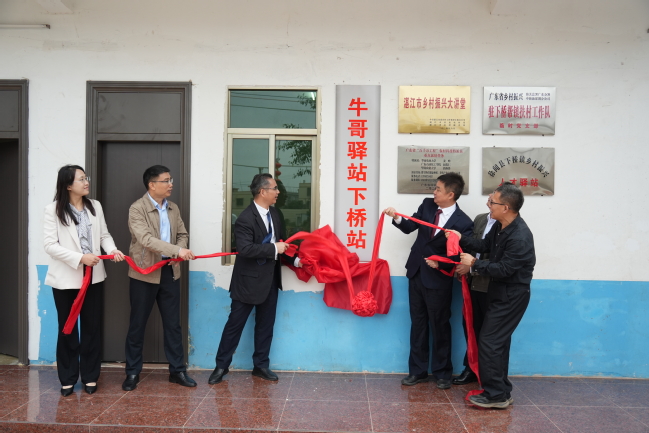 “牛哥驿站”徐闻总站负责人姜峰向同学们及与会者介绍了我校师生服务徐闻的做法与成效。陈乐天、吴国雄等为“湛江市乡村振兴大讲堂”入驻“牛哥驿站下桥站”揭牌。
